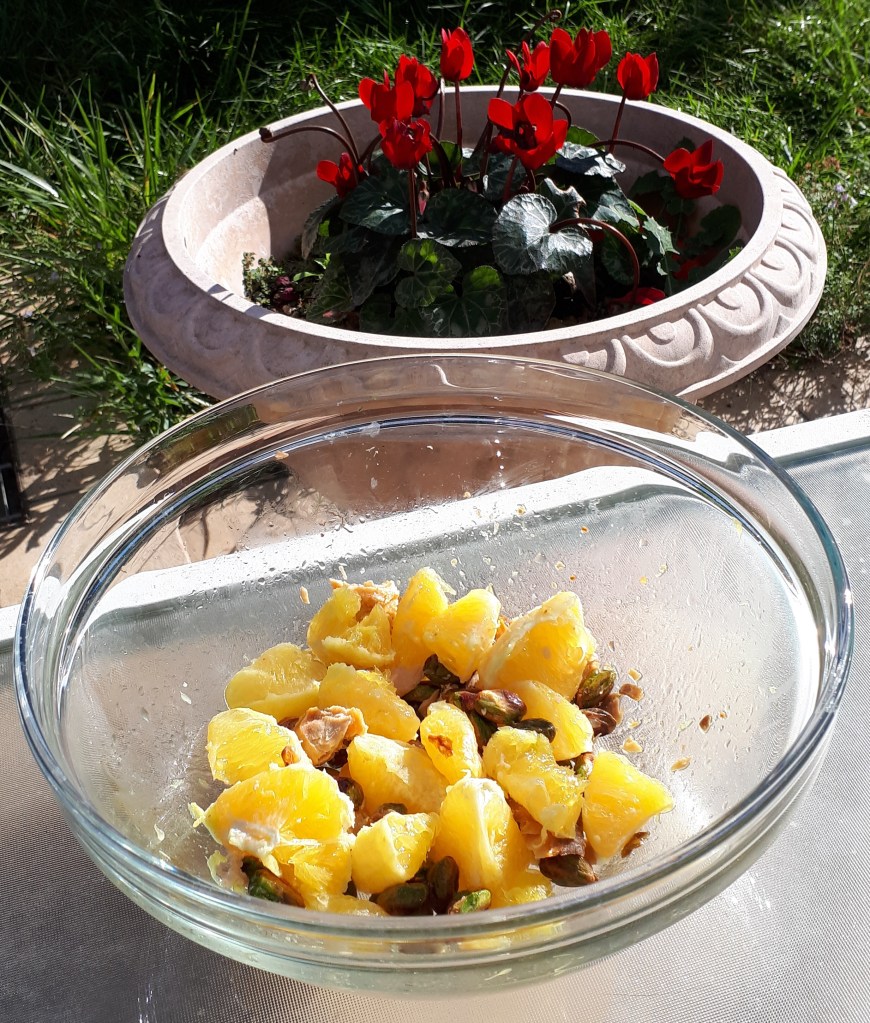 Così ne ho approfittato per stare un po’ in giardino e preparare un’insalata svuota frigo, che penso sarà la mia insalata dell’anno, semplice e buona, fatta di tranci di salmone selvaggio arrosto, arance e pistacchi salati, il tutto condito da un bel po’ di olio EVO.