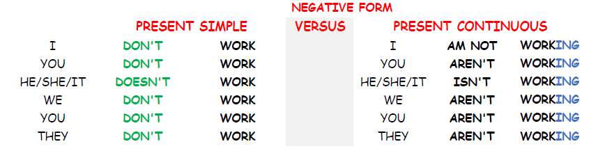 Analizziamo di seguito le differenze tra come si forma il present simple e il present continuous: mentre il present simple in genere è sempre uguale alla forma base del verbo, tranne che nella terza persona singolare, in cui va aggiunta una s, il present continuous si forma aggiungendo al present simple del verbo essere la radice del verbo seguita da -ing.