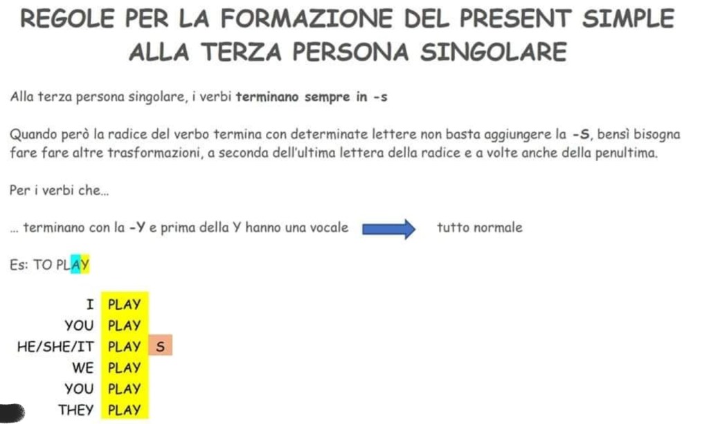 Per quanto riguarda la formazione del present simple nella terza persona queste sono le regole ortografiche: