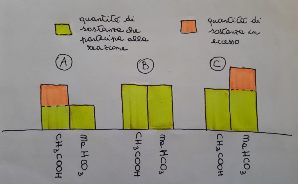 numero di moli NaHCO3 = numero di moli CH3COOH –> non c’è il reagente limitante, tutto avviene secondo i precisi rapporti stechiometrici e tutti i reagenti vengono consumati del tutto