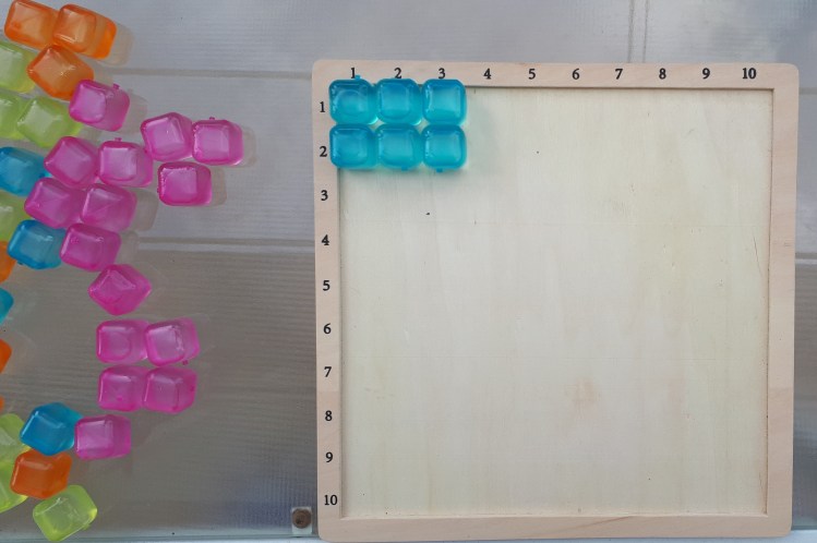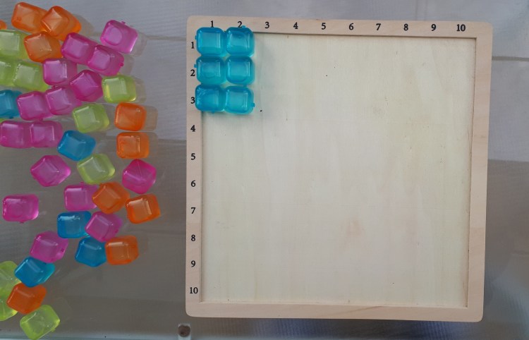 Nelle tabelline possiamo individuare delle coppie di numeri che hanno lo stesso prodotto, come ho evidenziato, per i bambini più piccoli, da questo modellino fatto con cubetti di ghiaccio: 2×3=6 e 3×2=6