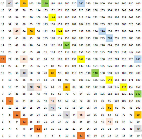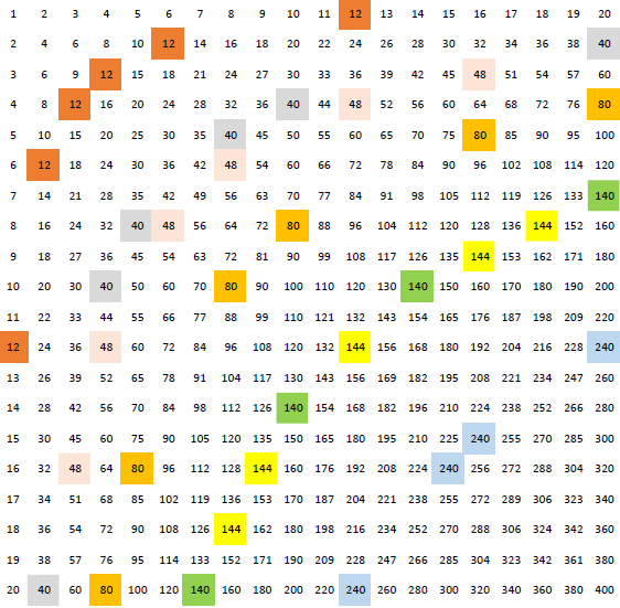 Questa è l’immagine delle tabelline fino a 400, con evidenziati alcuni prodotti: è evidente che formano dei tratti di rami di iperbole come se si trovasse nel quarto quadrante.