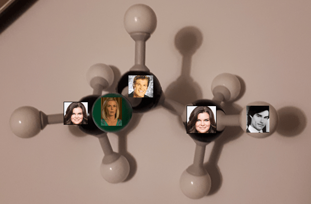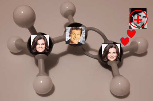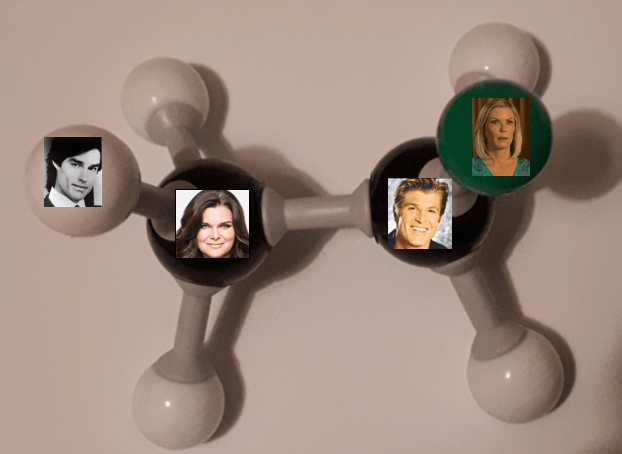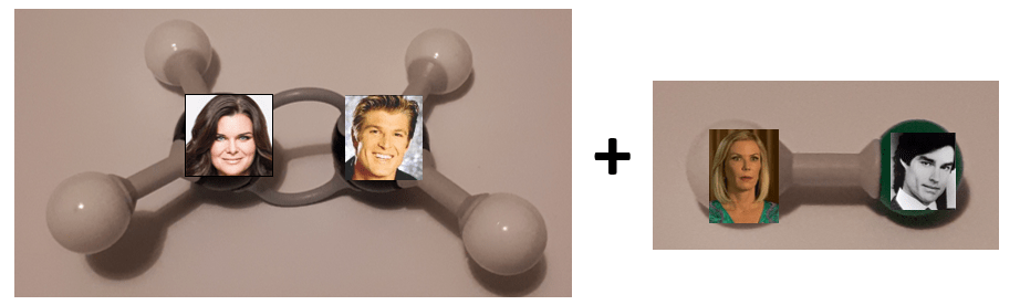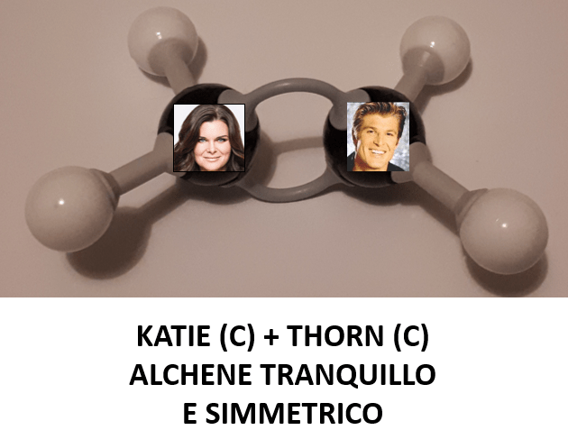 Poi più al centro della tavola periodica ci sono i tipi più tranquilli (tipo il carbonio), che sono un po’ meno assetati di sesso, a loro piace di più avere rapporti di amicizia, infatti tendono ad essere considerati un po’ ibridi e qualche volta lo diventano davvero, come ad esempio quando decidono di diventare amici di un gruppo di idrogeni e formano gli alcani o gli alcheni, questo per dire che il carbonio in condizioni normali è abbastanza pacioccone, per niente aggressivo, forse come i fratelli minori di Ridge e di Broke, Thorn e Katie, che mi sembra fossero i romanticoni paciocconi della storia (a dire la verità non sono sicura che lo fossero sulla telenovela, ma facciamo finta che lo siano stati), cioè immaginiamo che fossero due carboni amici tra di loro e con altri idrogeni, in una bella armonia, incontrandosi abitualmente al locale “Alchene”, in modo simmetrico o in modo asimmetrico. Katie e Thorn sono dei carboni, quindi non vivono questa grande passione dovuta all’attrazione degli opposti come H Ridge e Cl Broke… ma a volte sono così affezionati tra di loro che sono legati proprio a doppio filo…