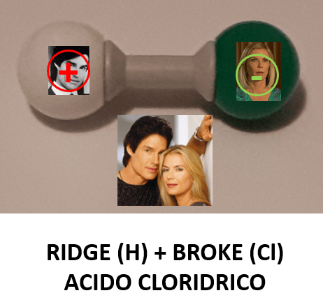 Insomma, ci sono gli elementi della tavola periodica che stanno là come i personaggi di una telenovela, a sinistra quelli che non vedono l’ora di disfarsi degli elettroni che hanno esternamente, come i playboy più pericolosi, tipo l’idrogeno Ridge Forrester, a destra quelli che invece sono assetati di elettroni e appena possono ne catturano uno, tipo il cloro Broke Logan (che tra l’altro mi sembra che nella fiction sia proprio laureata in chimica), insomma quando si incontrano questi due fanno proprio faville insieme, uno che non vede l’ora di sbarazzarsi del suo elettrone e una che brama di averne uno in più… (scusate, ma ricordo solo Beautiful, perché la vedevano le mie coinquiline all’università).