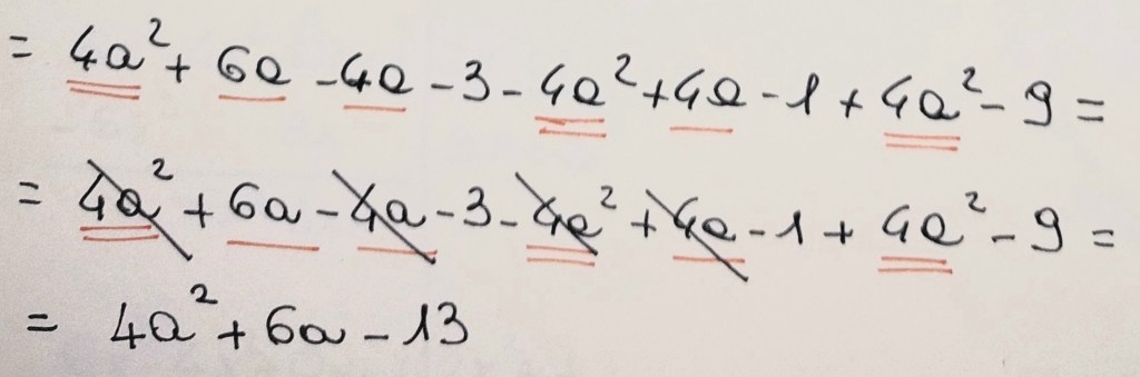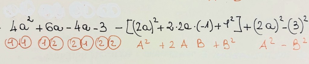 Attenzione a quando si trasforma ciò che è dopo un meno da moltiplicazione di due o più membri ad addizione o sottrazione: affinché il segno negativo sia applicato a tutti i membri è necessario usare una parentesi, nel caso in esame quadra, perché abbiamo usato le parentesi tonde per applicare la formula del prodotto notevole.