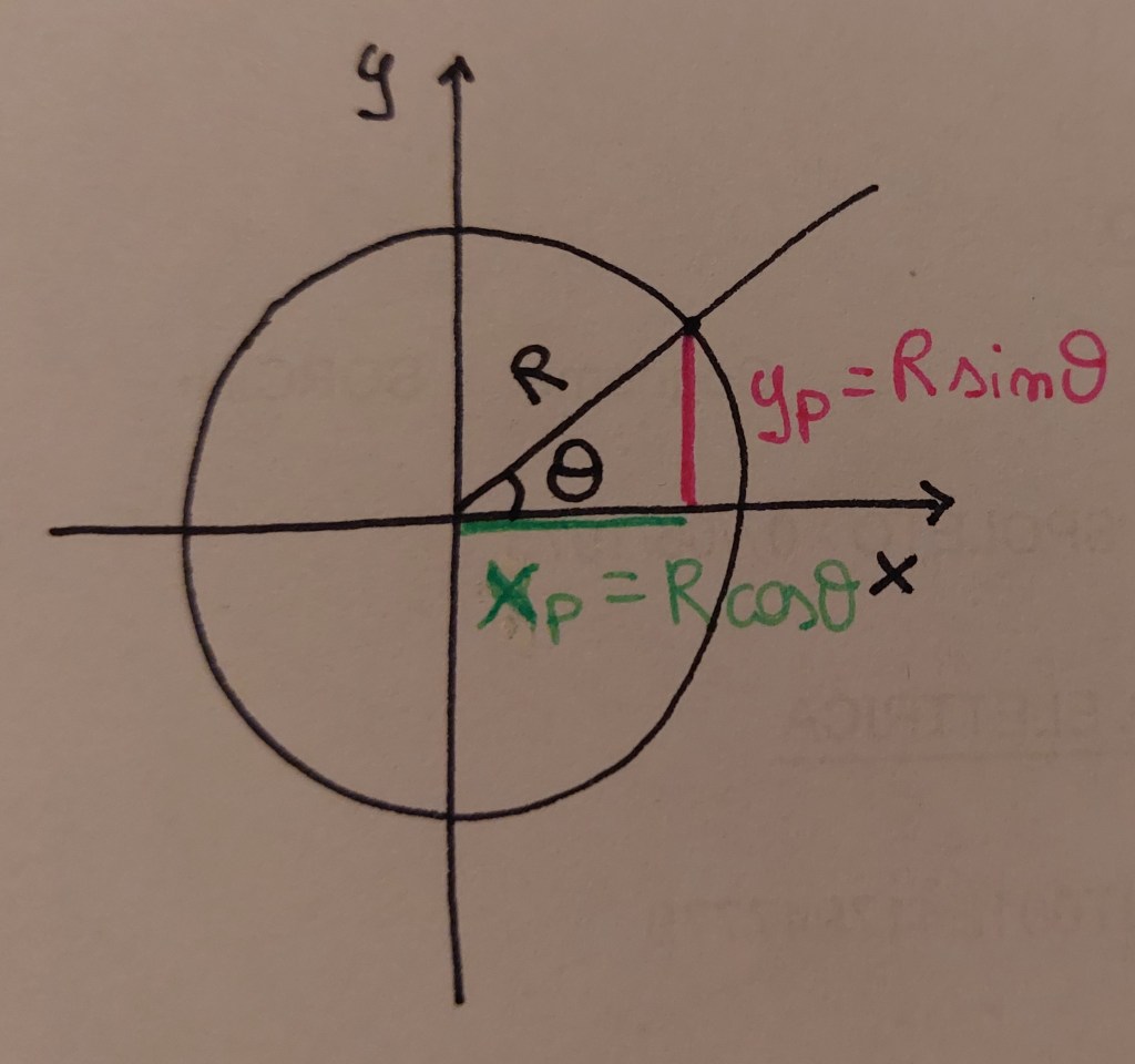 Per ripassare la trigonometria compariamo seno e coseno nella circonferenza trigonometrica (che ha raggio uguale a 1) e quella con raggio R, in cui il raggio corrisponde con l’ipotenusa del triangolo rettangolo che ha come cateti le proiezioni del raggio sull’asse x (raggio per coseno) e quella del raggio sull’asse y (raggio per seno).