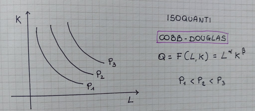 Si tratta di grafici tridimensionali, perché le unità di produzione Q = F(L,K) e quindi dipendono da due variabili e vengono rappresentate da delle curve dette isoquanti: a ogni curva corrisponde un livello di produzione.