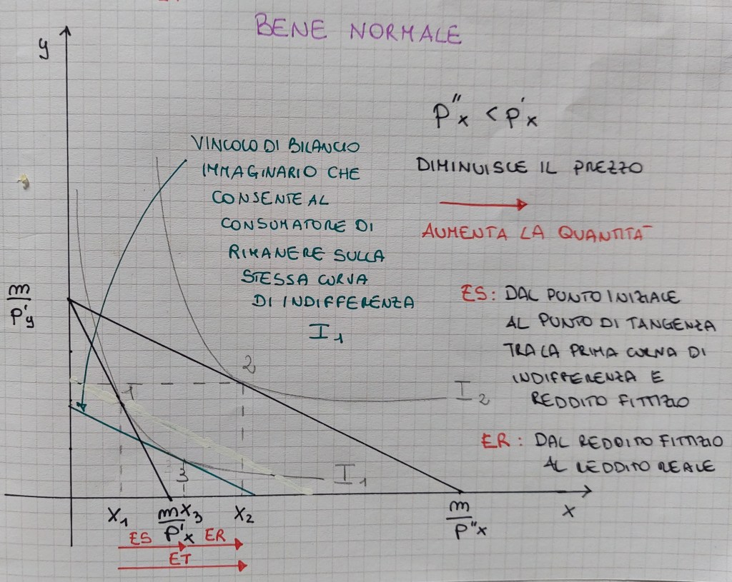 Per scindere l’effetto reddito da quello sostituzione, si traccia un vincolo di bilancio fittizio, parallelo al secondo vincolo di bilancio e tangente alla prima curva di indifferenza: il punto 3 è il punto di tangenza e l’effetto sostituzione è quello che avviene nel passare dal punto 1 al punto 3.