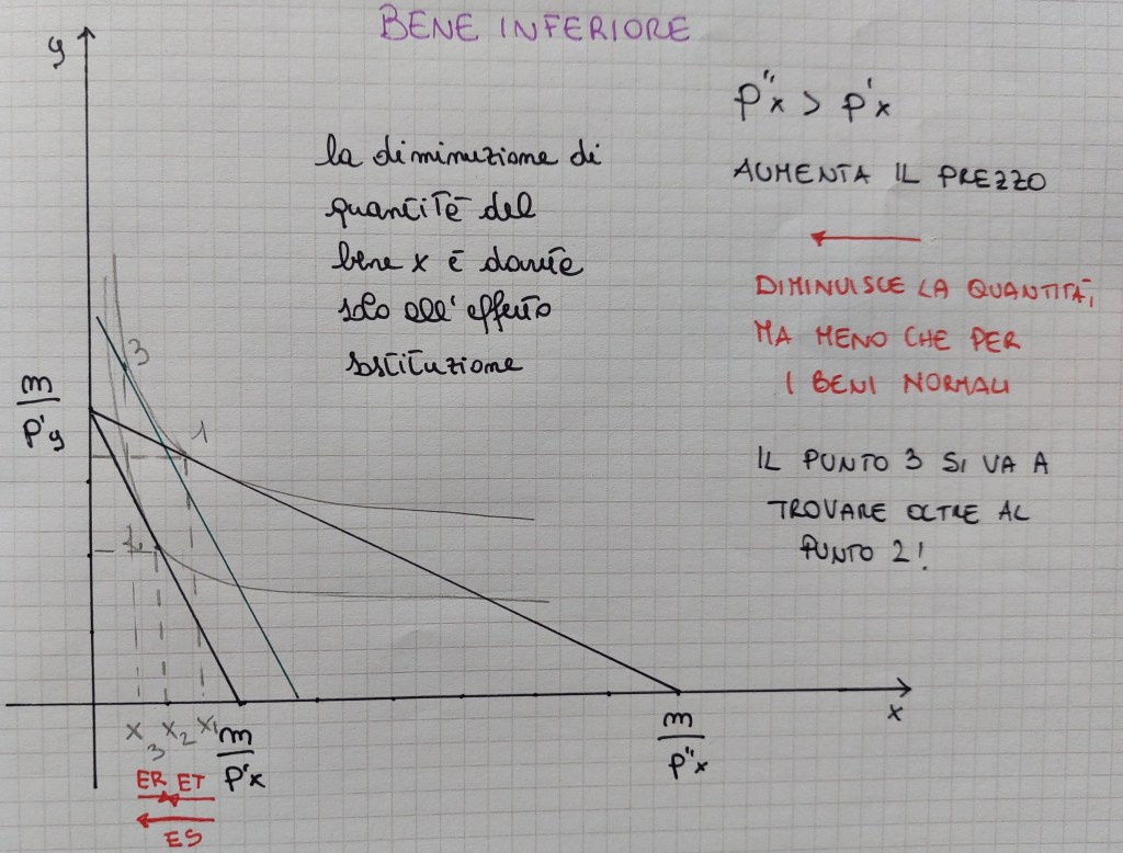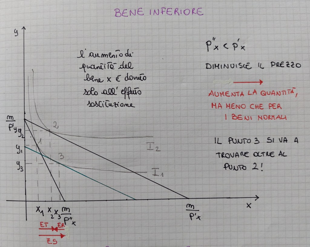 Per quanto riguarda i beni inferiori il procedimento analogo, ma visto che all’aumentare del reddito il consumatore diminuisce il consumo dei beni inferiori, l’effetto reddito va in direzione opposta all’effetto sostituzione, pur non riuscendo a sovrastarlo, in quanto in valore assoluto è sempre a esso minore, tranne che nel caso dei beni di Giffen.