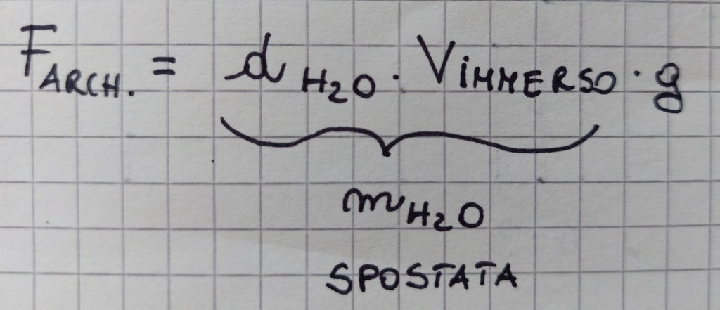 Risulta strano pensarlo, ma la forza di Archimede di calcola come una vera e propria forza peso (dell’acqua spostata) e come tale va calcolata, solo che non risulta rivolta verso il basso, bensì verso l’alto.