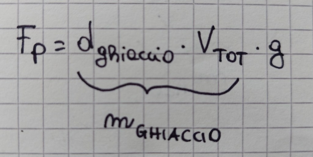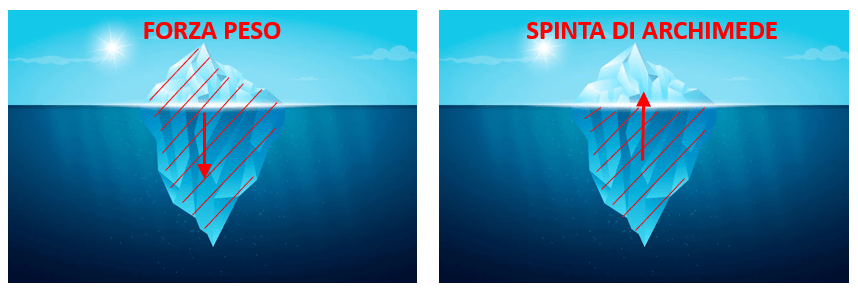 Quando un corpo è arrivato all’equilibrio di galleggiamento, forza peso e spinta di Archimede devono essere uguali in modulo e quindi, mentre la forza peso è provocata da tutto il volume del corpo, la spinta di Archimede è provocata solo dalla parte immersa, che all’equilibrio è diversa dal volume totale del corpo.