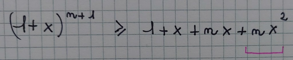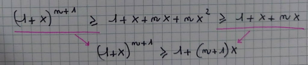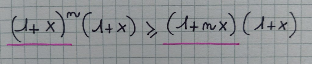A sinistra sviluppo l’espressione applicando la proprietà delle potenze secondo la quale la moltiplicazione di due termini che hanno la stessa base è uguale alla stessa base elevata a un esponente pari alla somma dei due esponenti: in questo caso (1+x) risulta elevato a 1, per cui basta aggiungere 1 a n. A destra invece sviluppo i calcoli della moltiplicazione.