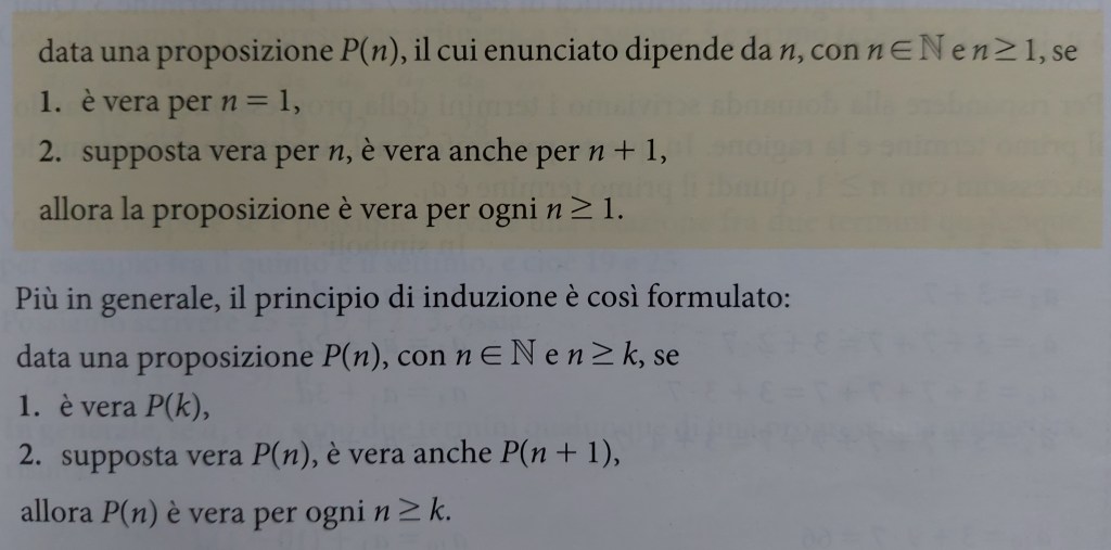 Il principio di induzione ci dice che (immagine tratta dal libro Matematica blu 2.0 per le Scuole superiori di Massimo Bergamini, Graziella Barozzi, Anna Trifone)