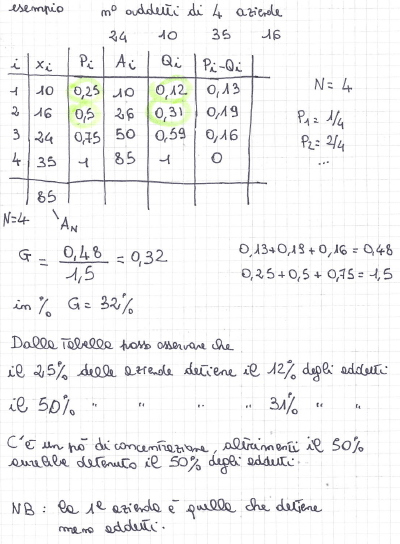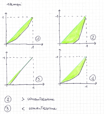 Area di concentrazione = l’area compresa tra la spezzata di concentrazione e il segmento di retta con estremi (0,0) e (1,1). È tanto maggiore quanto maggiore è la concentrazione.