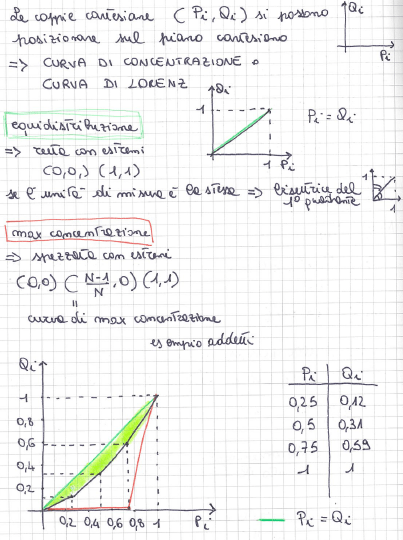 Curva di concentrazione o di Lorenz = spezzata che si ottiene congiungendo con segmenti di retta le coppie consecutive di punti di coordinate (0,0), (P1, Q1), (Pi, Qi), … , (PN,QN), (1,1);