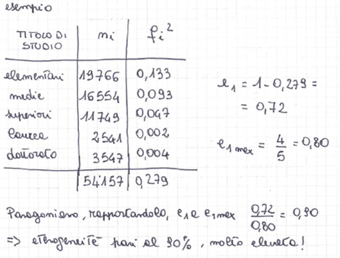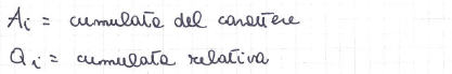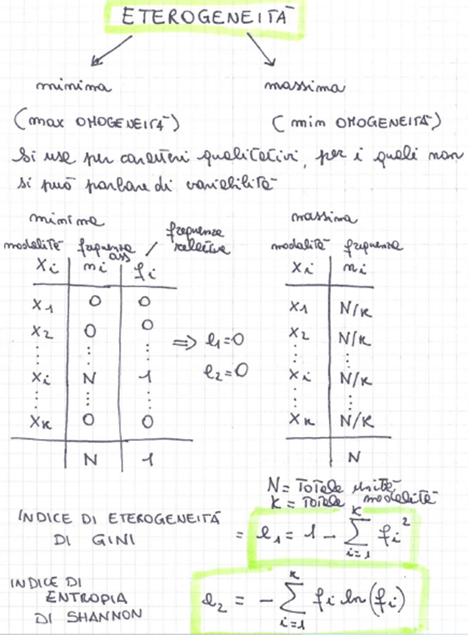 Eterogeneità: si usa per i caratteri qualitativi (non trasferibili), per cui non si può parlare di variabilità, al posto della concentrazione. Non potendo lavorare con le modalità, si lavora con le frequenze. Attenzione, si usa un altro indice di Gini per l’eterogeneità, diverso da quello visto per la concentrazione