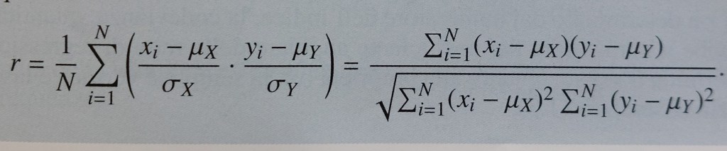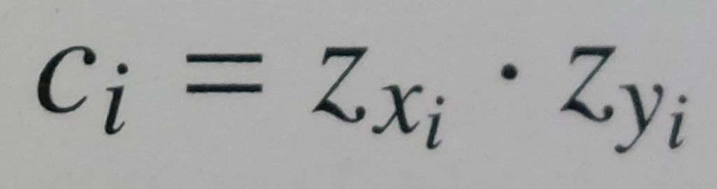 coefficiente di correlazione lineare di Bravais-Pearson = media aritmetica del prodotto i-esimo (ci) degli scarti standardizzati corrispondenti alle modalità i-esime di due caratteri (xi di X e yi di Y)