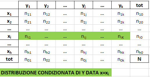 - la distribuzione condizionata del carattere Y dato X=xi è la distribuzione di Y limitatamente ai soggetti che presentato la modalità xi di X. Si ottiene associando a ogni modalità yj di Y la frequenza congiunta di (xi,yj), tenendo fissa xi.
