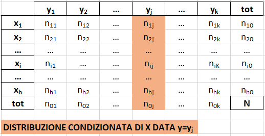 - la distribuzione condizionata del carattere X dato Y=yj è la distribuzione di Y limitatamente ai soggetti che presentato la modalità yj di X. Si ottiene associando a ogni modalità xi di X la frequenza congiunta di (xi,yj), tenendo fissa yj .