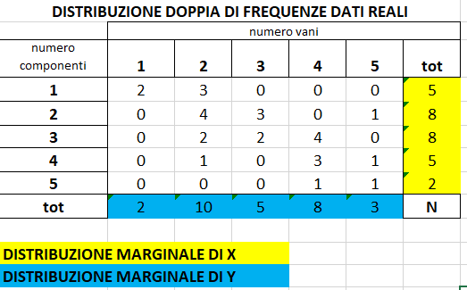 distribuzione doppia di frequenze = sintesi della distribuzione doppia disaggregata di due caratteri, che viene rappresentata tramite una tabella a doppia entrata o di contingenza