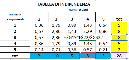 Ad esempio la cella n34 di seguito si ottiene moltiplicando la frequenza marginale n30 moltiplicata per la frequenza marginale della quarta colonna n04