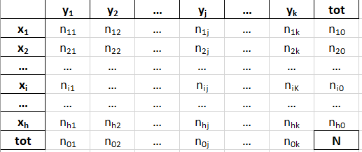 tabella a doppia entrata = tabella di contingenza = presenta nell’intestazione delle righe le diverse modalità del carattere X e nell’intestazione delle colonne le diverse modalità del carattere Y e per ogni coppia di modalità dei due caratteri viene indicata la corrispondente frequenza congiunta (nij ) per ogni coppia di modalità di due caratteri (xi,yj), con i che varia da 1 a h e j che varia da 1 a h.