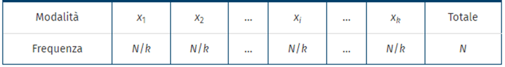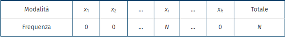 schema minimante di variabilità = tutti i termini della distribuzione sono uguali fra loro, cioè la popolazione è omogenea rispetto a un carattere (che risulta concentrato in una sola modalità di frequenza assoluta N)