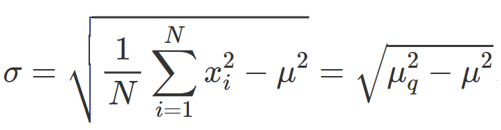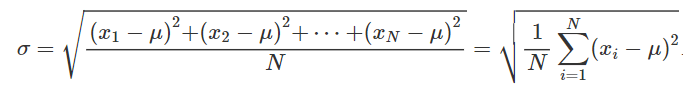 • scarto/scostamento quadratico medio = deviazione standard = indice di variabilità dato dalla media quadratica degli scarti/radice quadrata della varianza