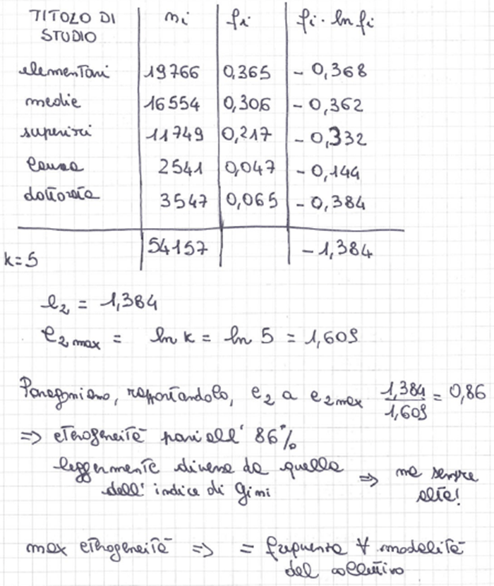 massimo dell’indice di entropia di Shannon = ln (k) e si tocca nel caso di massima eterogeneità (mentre nel caso di minima eterogeneità l’indice di entropia di Shannon è 0)