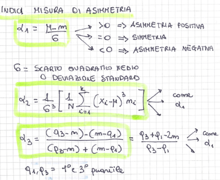 ASIMMETRIA: può essere POSITIVA E NEGATIVA a seconda del segno del primo indice (media maggiore della mediana o viceversa)