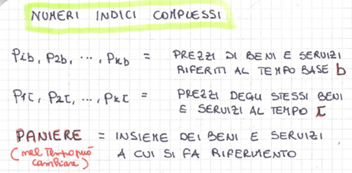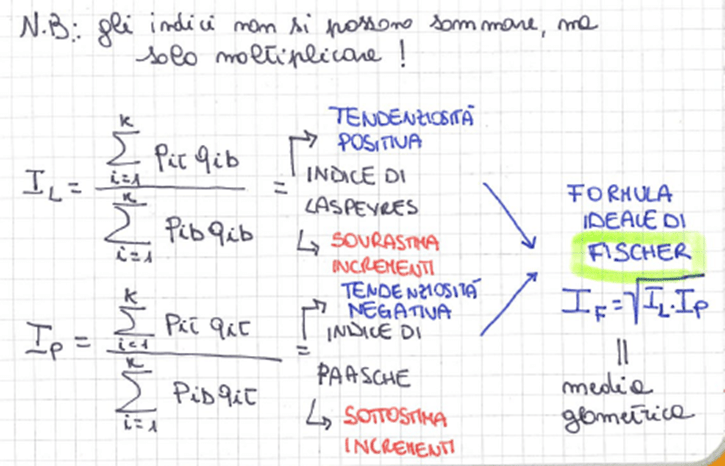 • numero indice di Fisher = media geometrica tra il numero indice di Laspeyres e il numero indice di Paasche (formula ideale, in quanto riassorbe le tendenziosità degli altri due)