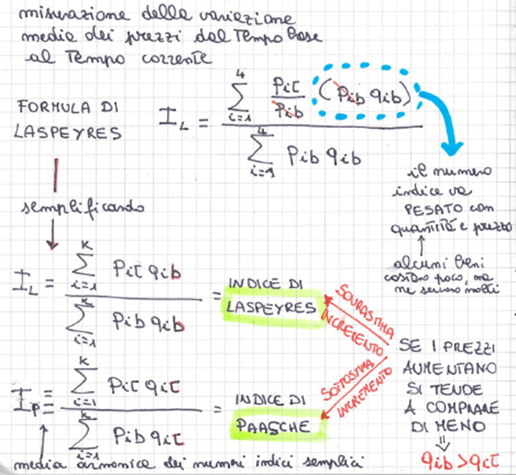• numero indice di Laspeyres = media aritmetica ponderata utilizzando le quantità al tempo base. Ha tendenziosità positiva in caso di inflazione, ma è la formula più applicata
