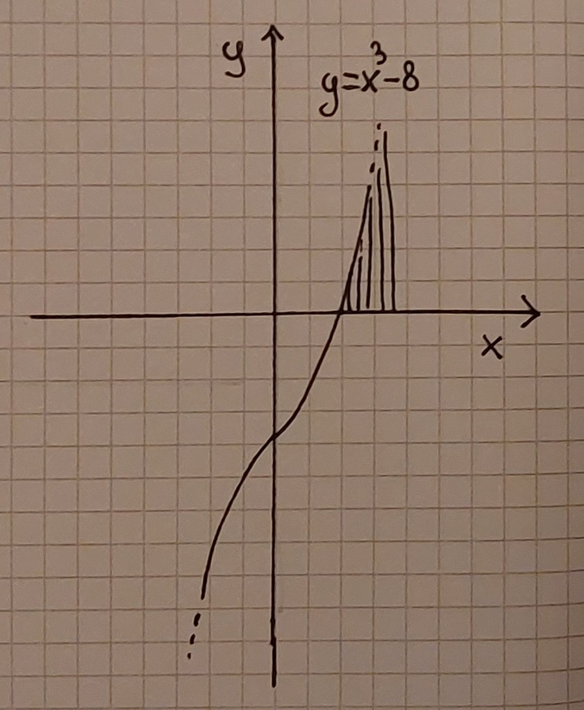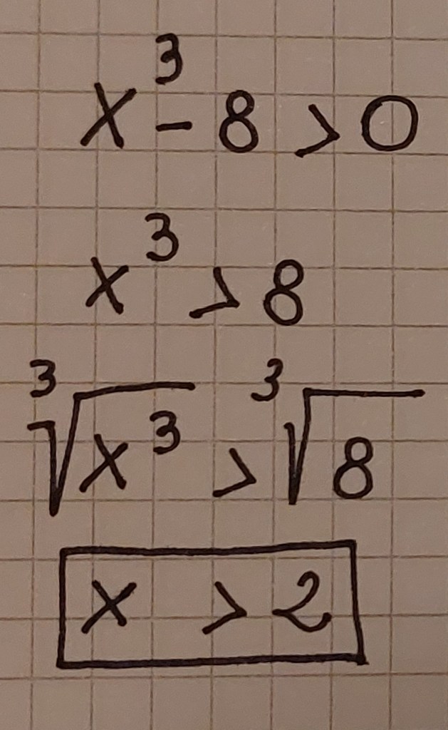 Se ci troviamo davanti a un’equazione di terzo grado che presenta solo il termine di grado 3 e il termine noto la soluzione è abbastanza simile: basta portare il termine senza la x a destra e fare la radice cubica a destra e a sinistra e si troverà un unico intervallo illimitato come soluzione, che in questo caso corrisponde con le x maggiori di 2:
