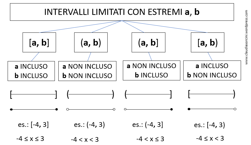 Dati due numeri reali a e b, gli intervalli limitati indicano che la variabile può essere compresa tra due valori, uno all’estremo inferiore (il minimo valore che può assumere la variabile) e uno all’estremo superiore (il massimo valore che può assumere la variabile).