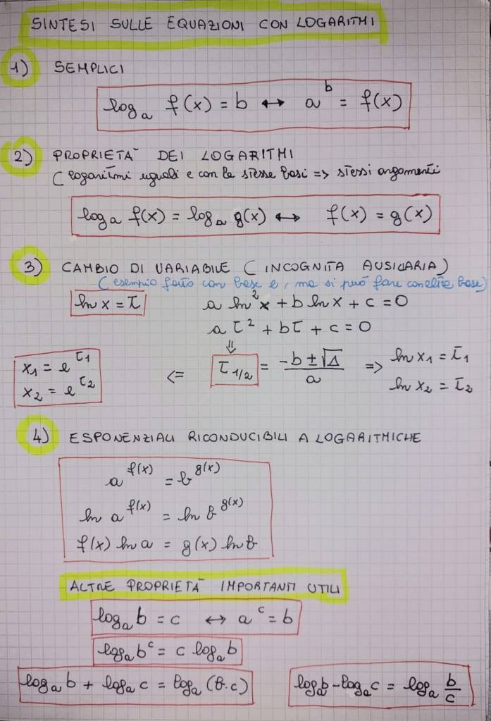 Di seguito un riassunto delle formule più utili delle equazioni logaritmiche o che si risolvono con i logaritmi.