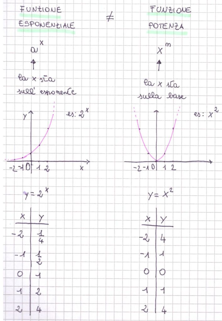 La funzione esponenziale si differenzia dalla funzione potenza, in quanto la x non sta sulla base, ma sull’esponente: questo fa sì che l’andamento di queste due funzioni sia completamente diversa.