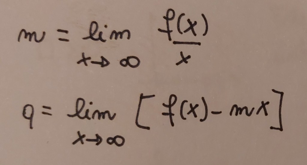 Se il limite è infinito c’è quindi la possibilità che esista l’asintoto obliquo, che è una retta del tipo y=mx+q, e quindi occorre trovare m e q: