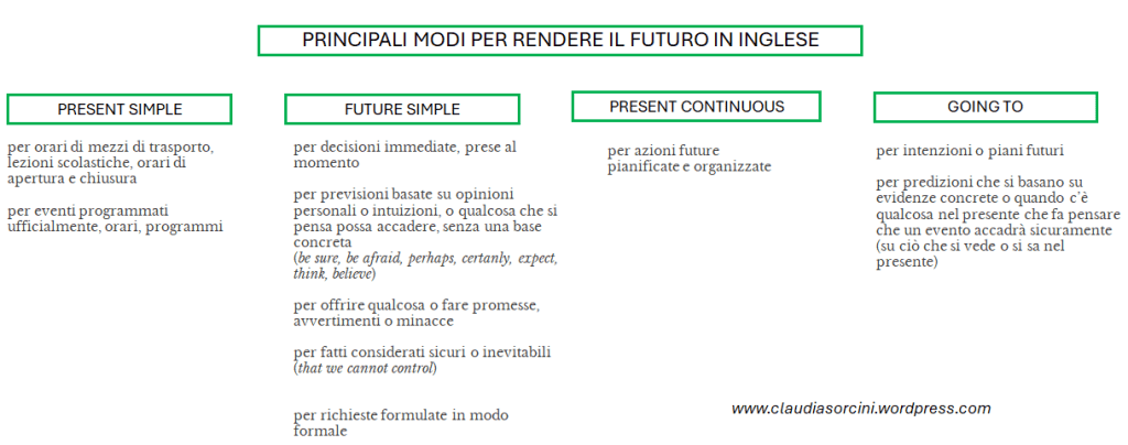 L’inglese offre una varietà di modi per esprimere il futuro, ciascuno con le sue sfumature e contesti d’uso specifici. In questo articolo esploreremo in dettaglio i principali tempi e costruzioni verbali utilizzati per parlare del futuro: il present simple, il future simple, il present continuous, il “going to”. Saranno inoltre trattati il future continuous e il future perfect.