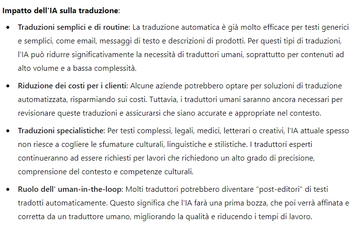 Ho chiesto a chatgpt quali sono invece i lavori che verranno sostituiti in maniera maggiore dall’IA e in particolare cosa succederà ai traduttori e qui riporto lo screenshot di parte della sua risposta