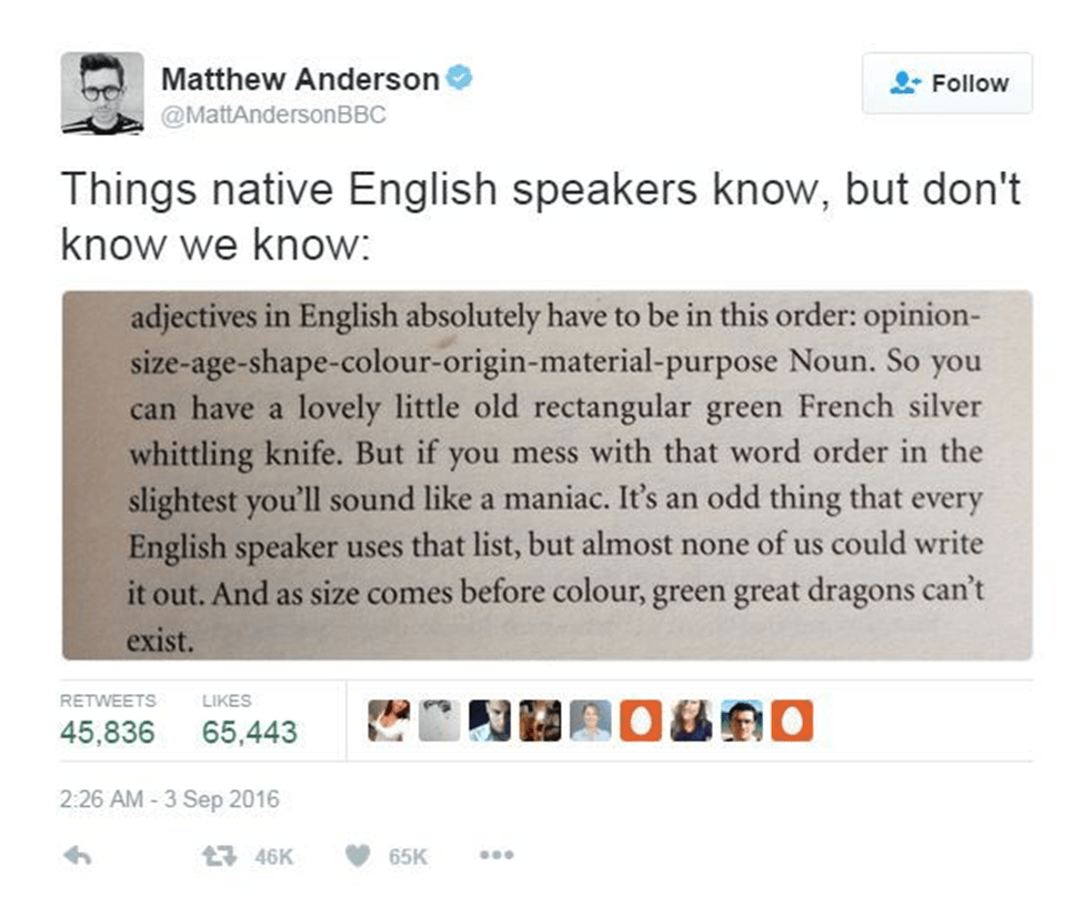 in cui viene citato il Tweet di Matthew Anderson (che si definisce un grammar Nazi): “Things native English speakers know, but don’t know we know.” (Cose che noi madrelingua inglesi conosciamo senza sapere di conoscerle) con un estratto del volume sopra citato.