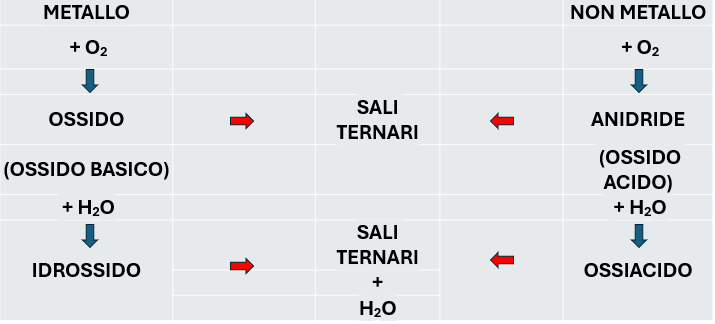 Andando ad aggiungere acqua oltre a metallo o non metallo e ossigeno avremo anche l’idrogeno come componente (composti ternari) e gli ossidi basici formeranno gli idrossidi, mentre le anidridi gli acidi.