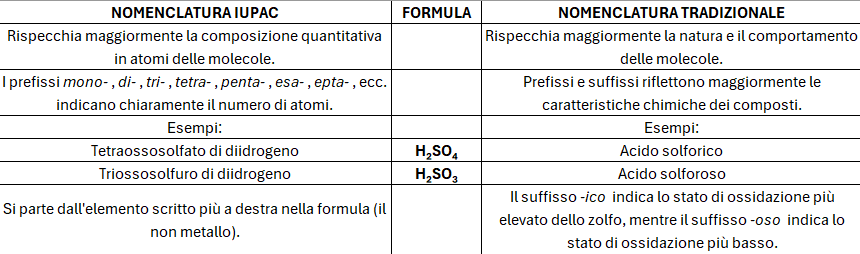 Le stesse molecole, nella nomenclatura IUPAC, vengono chiamate rispettivamente acido triossosolforico e acido tetraossosolforico. In alcuni casi le molecole di acqua che possono reagire con l’anidride sono più di una, per questo motivo si aggiunge il prefisso meta- se una, piro- se due e orto- se tre.